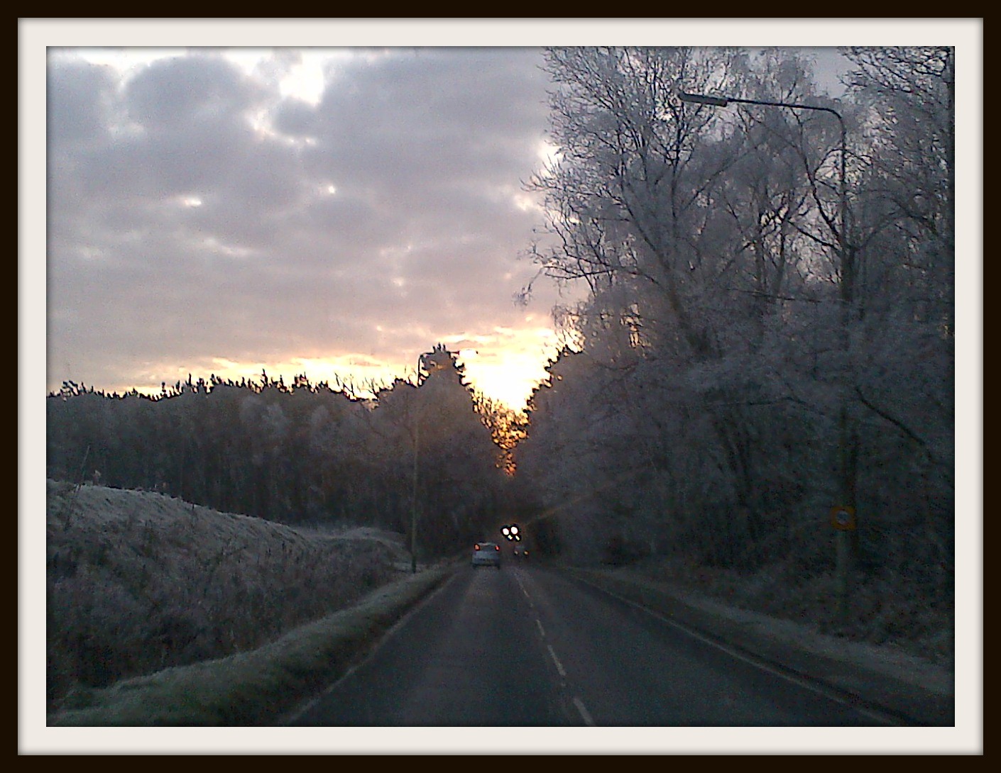 Slightly out of focus and the camera on my phone is not great but what a fantastic picture. Sun coming up and frost on all the trees.
